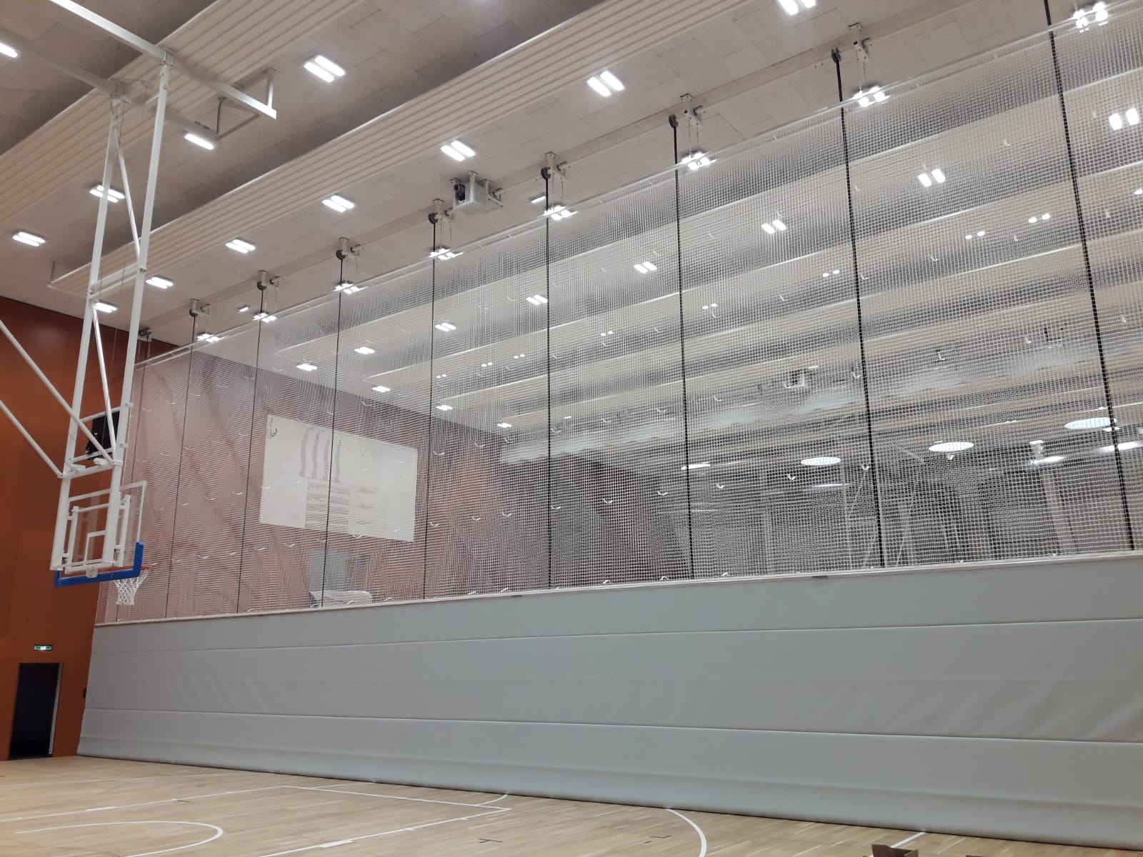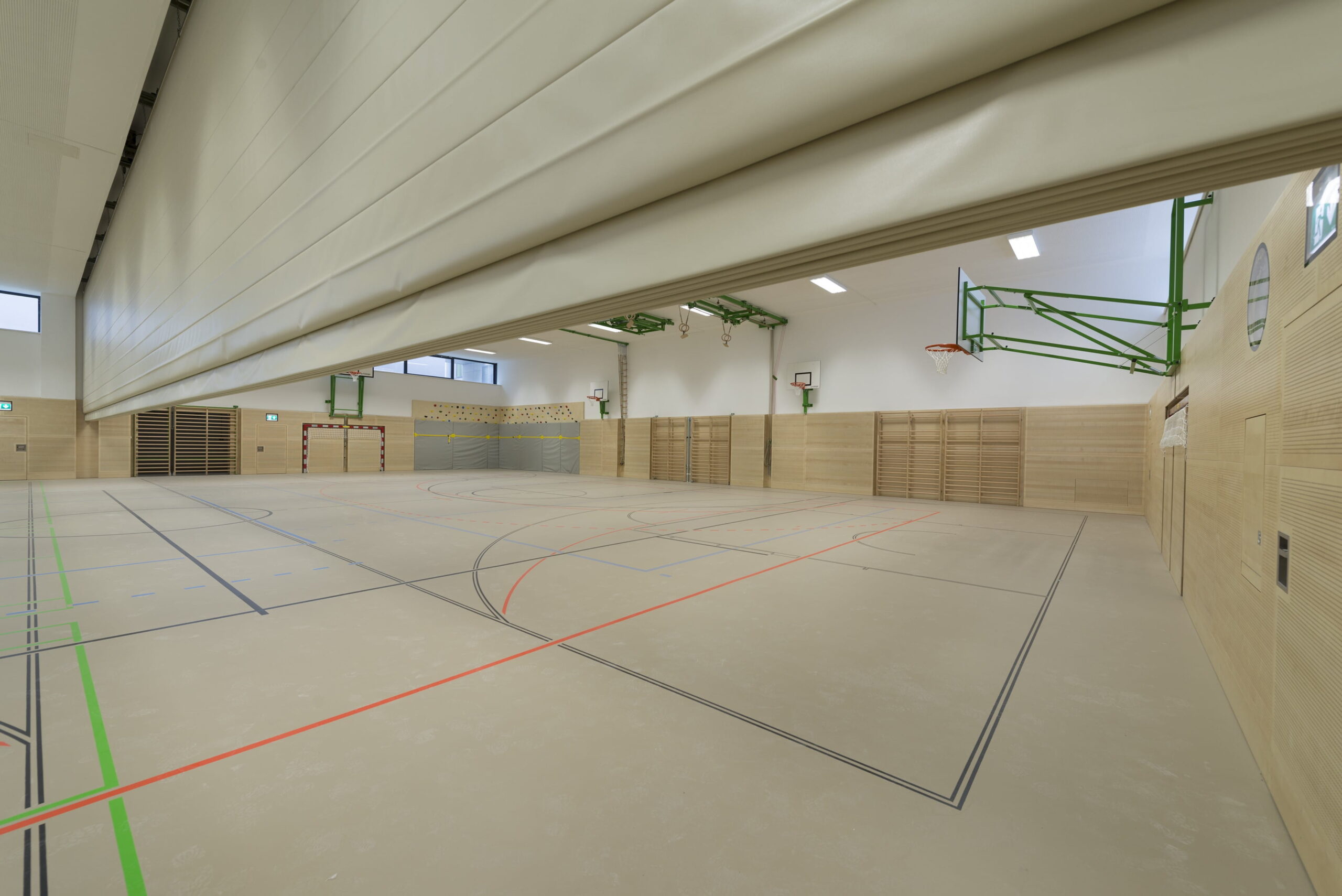 Unsere Trennvorhänge werden direkt vor Ort passgenau angefertigt. Das Behangmaterial wird exakt eingepasst und unmittelbar vor Ort vernäht, sodass sich der Vorhang perfekt an die jeweilige Hallengeometrie anpasst. Diese Vorgehensweise gewährleistet eine saubere Ausführung, höchste Funktionalität und einen optimalen Faltenlauf – auch bei komplexen Raumverhältnissen.